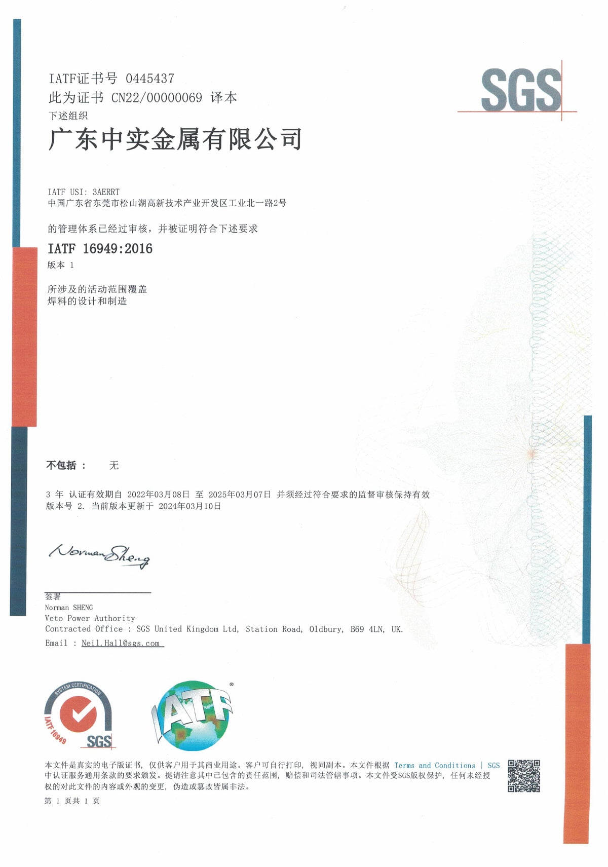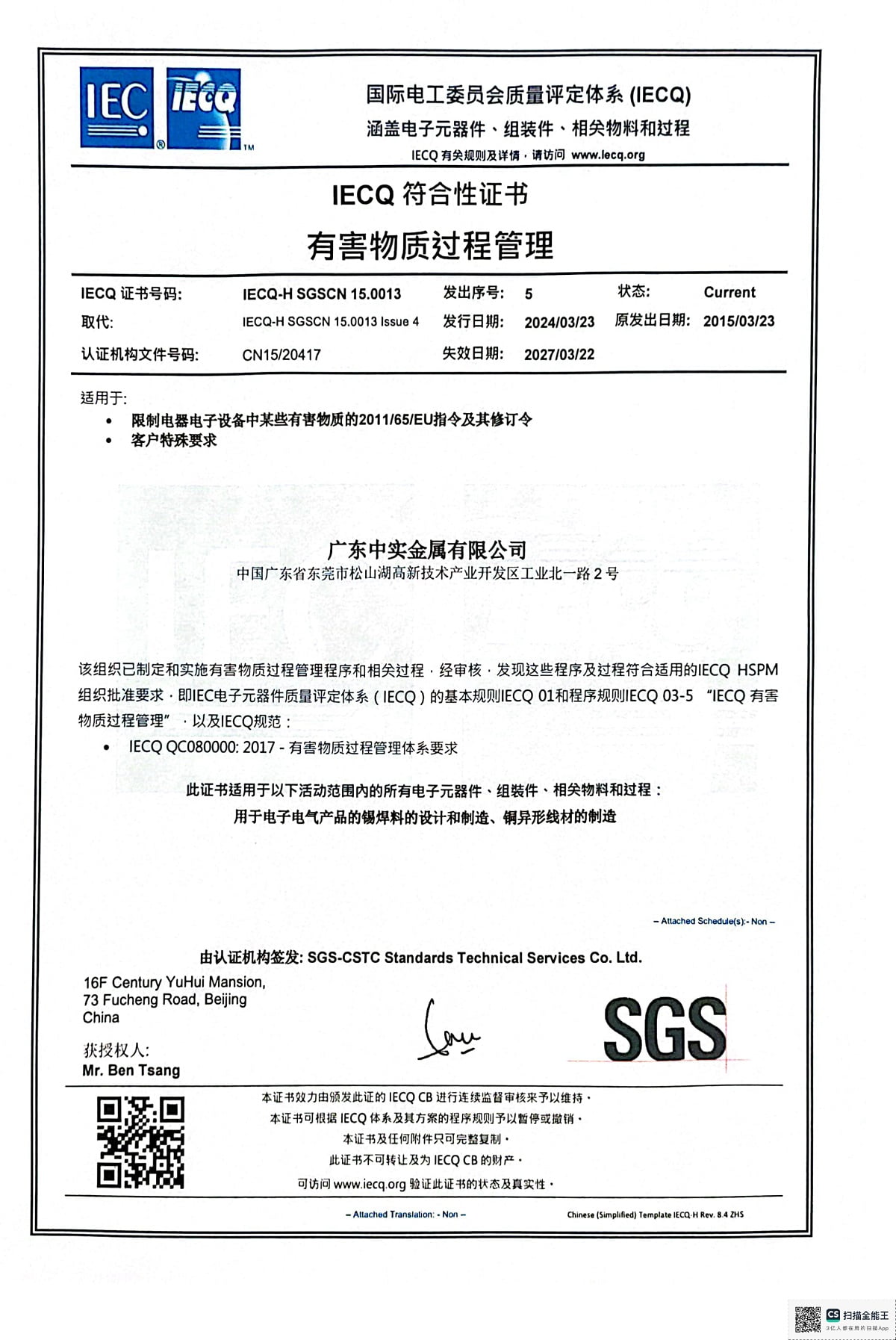 Certificate Number: IECQ-H SGSCN 15.0013